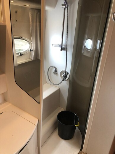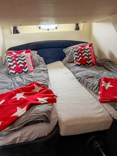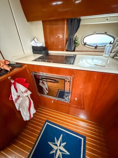 Alakannella odottaa tilava salonki, jossa on runsaasti istumatilaa, hyvin varusteltu pentteri ja panoraamaikkunat, jotka tuovat sisätiloihin runsaasti valoa. Kaksi erillistä hyttiä tarjoavat hyvät säilytystilat, ja erillisessä WC-tilassa on suihku ja kaksi pesuallasta. Peräkansi on varustettu integroidulla uimatasanteella, ruokapöydällä ja istuinryhmällä. Lasikuiturunko takaa vakaan ja pehmeän kulun kaikissa olosuhteissa.