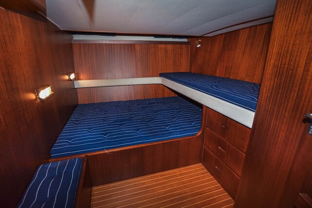 Perässä on hytti, jossa on sekä parivuode että yksittäinen vuode ja oma WC suihkumahdollisuudella.