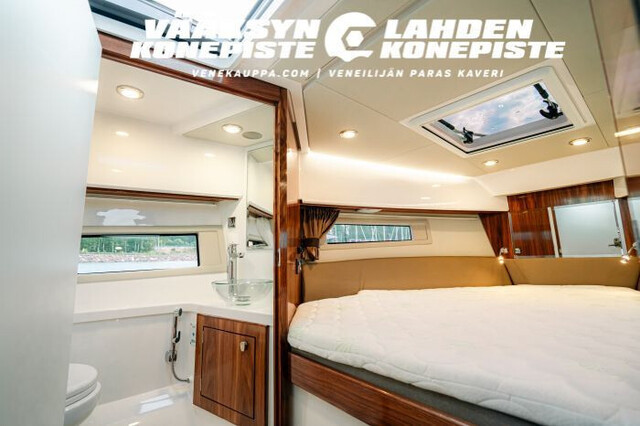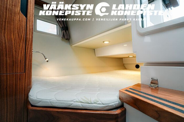 Astuttuasi alas keulahyttiin avaruuden ja mukavuuden tunne on nsimmäinen asia, jonka aistit: leveä päämakuuhuone, verholla erotettu keskivuode, tilava pääty ja runsaat säilytystilat - ja tämä kaikki kahdeksanmetrisessä veneessä!